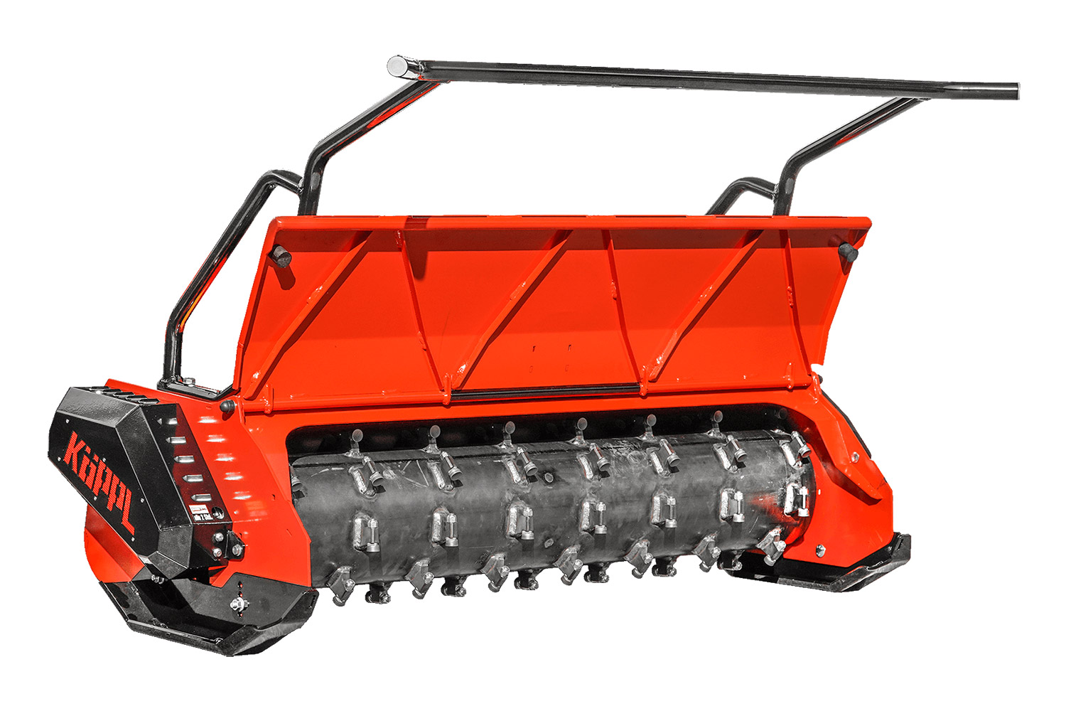 Lesní mulčovač s robustní ocelovou konstrukcí. Robustní lesní zařízení pro mulčování větviček, větví a kmenů do průměru 8 cm díky mulčovacímu rotoru, který se otáčí kolem své osy až 2578 krát za minutu.