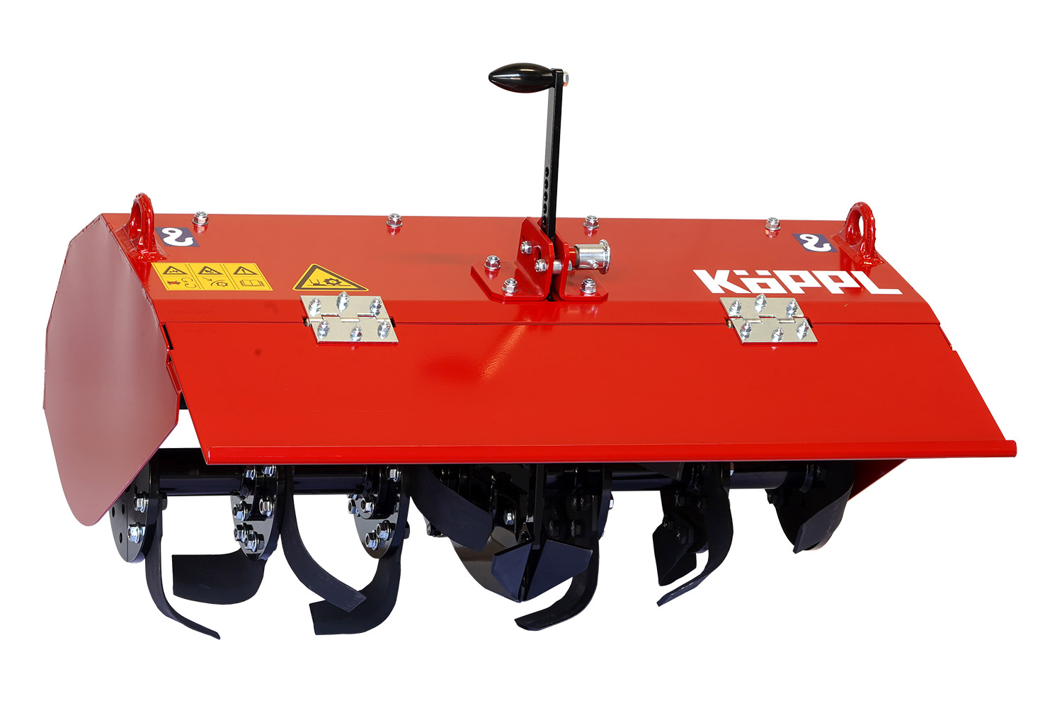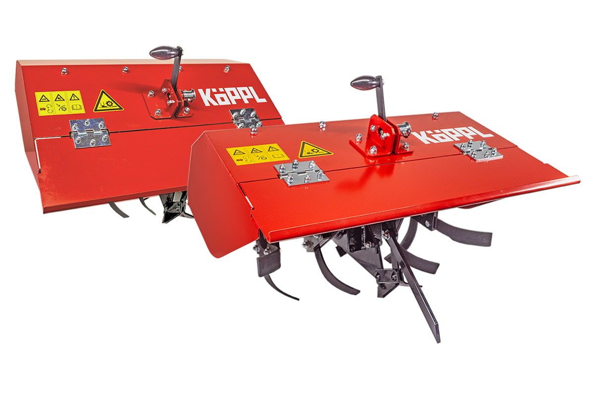 Lehký kultivátor s bočním řetězovým pohonem, nastavitelnými ližinami a montážní přírubou Köppl s integrovanou ráčnovou spojkou (4 nože na každé ze 6 otočných přírub).