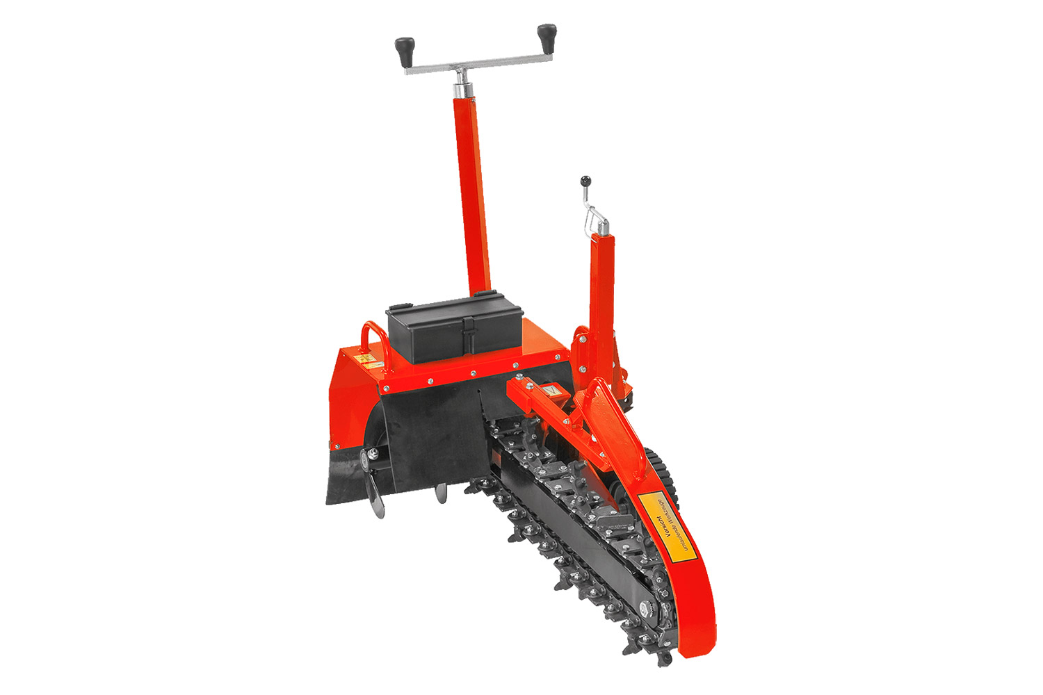 Rýhovač a drážkovač kabelů pro zavlažovací systémy, podzemní kabely a odvodnění. S vrtákem. Řetěz s ocelovými zuby a hroty z karbidu s úhlovými řeznými zuby.
